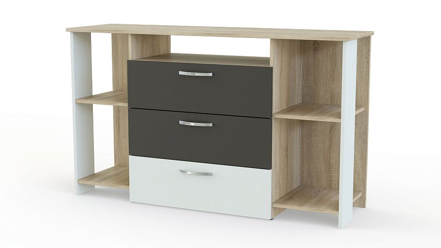 Комод Дабл 3 BMS дополнит интерьер современной спальни или гостиной и поможет разместить большое количество вещей, а также оформить зону ТВ. Комбинированная модель оборудована широкой столешницей, тремя выдвижными ящиками, нишей под аппаратуру и открытыми боковыми секциями для книг или декоративных мелочей. Корпус светлого древесного оттенка дополняет фасад в белом и графитовом цвете. Купить комод Дабл 3 BMS по доступной цене вы сможете в нашем интернет-магазине.