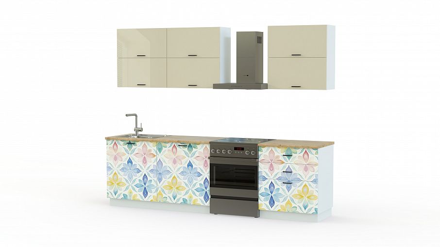 Кухня Альберта 13 BMS выполнена в спокойной нейтральной гамме, которая настраивает на комфортное времяпрепровождение. Светлый глянец верхних фасадов, нежный орнамент на нижних и природный рисунок столешницы создают стильный микс. Для вашего удобства распашные шкафы дополнены тумбой с тремя выдвижными ящиками и навесными модулями с дверцами, открывающимися вверх. Купить кухню Альберта 13 BMS, изготовленную по вашим размерам, приглашаем к нам в интернет-магазин.