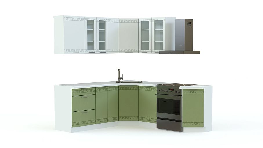 Интересная угловая модель не только украсит Ваш дом, но и принесет с собой уют и комфорт. Выполнена кухня Греция 02 BMS в оригинальном цветовом исполнении, темный низ модных цветов и белый верх ‒ при желании цвета Вы можете поменять. Для удобства пользователей внизу размещается пять больших тумб, особо выделяются оригинально оформленные угловые элементы и пять навесных шкафов, два из которых со стеклянными дверками. Заказать у нас кухню Греция 02 BMS Вы можете, изменив размеры всей модели или ее отдельных элементов.
