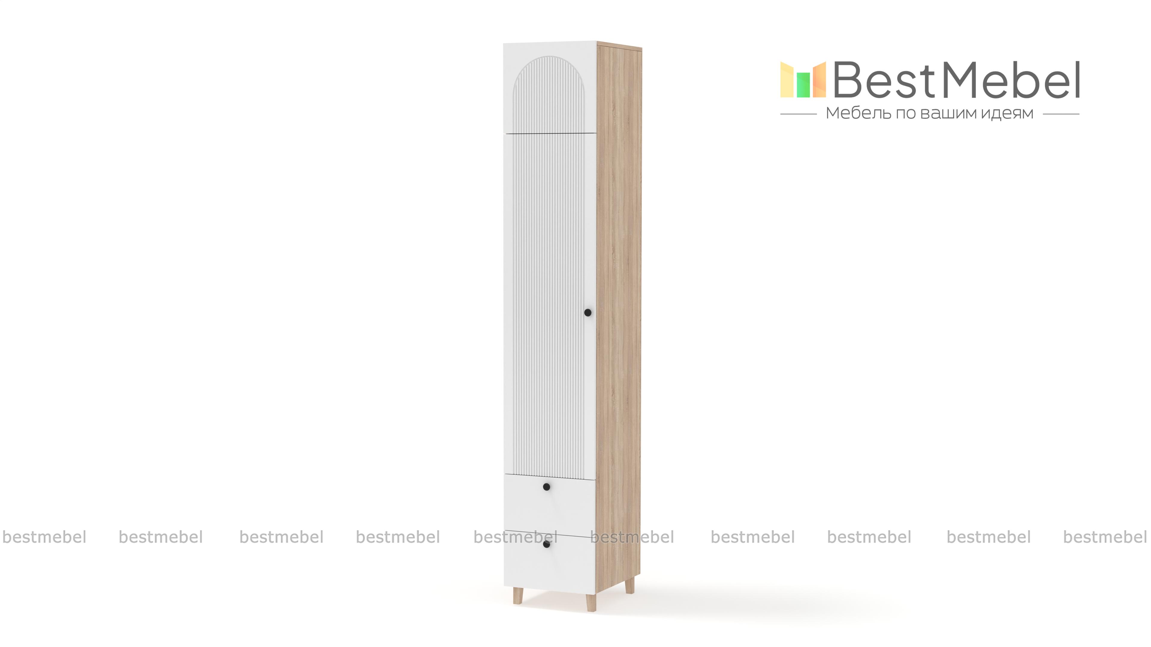 Шкаф-пенал Рене 14 BMS предлагает для хранения не только стандартное распашное отделение, но и два выдвижных ящика снизу, а также антресоль. Продуманная комплектация позволяет легко поддерживать порядок в вещах, а размеры пенала оптимальны для комнат малого метража. Для стильного вида — темный рифленый фасад с круглыми ручками и высокие опоры оттенка светлого дерева. Купить шкаф-пенал Рене 14 BMS, изготовленный по вашим размерам, приглашаем на сайт нашего интернет-магазина.