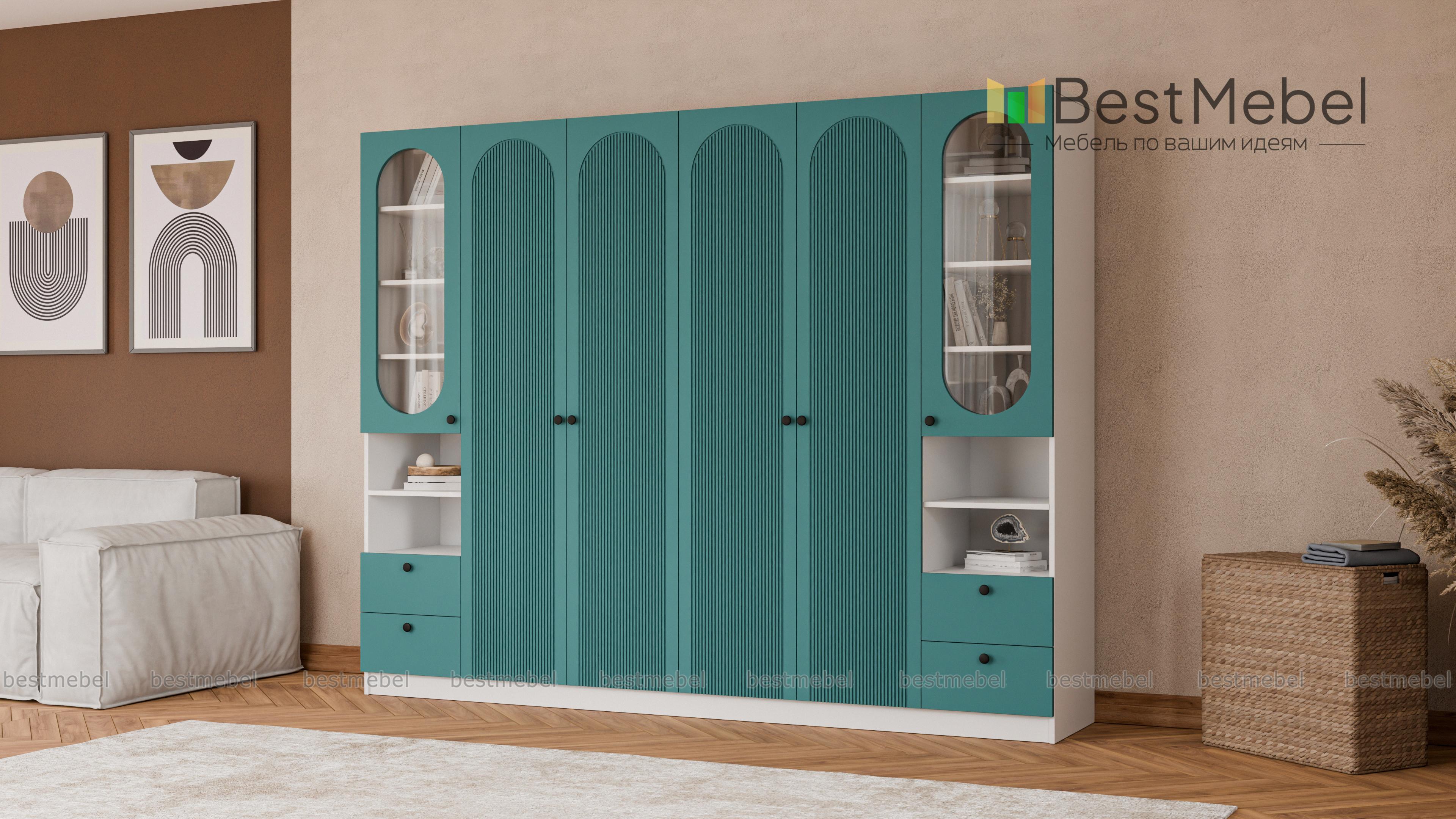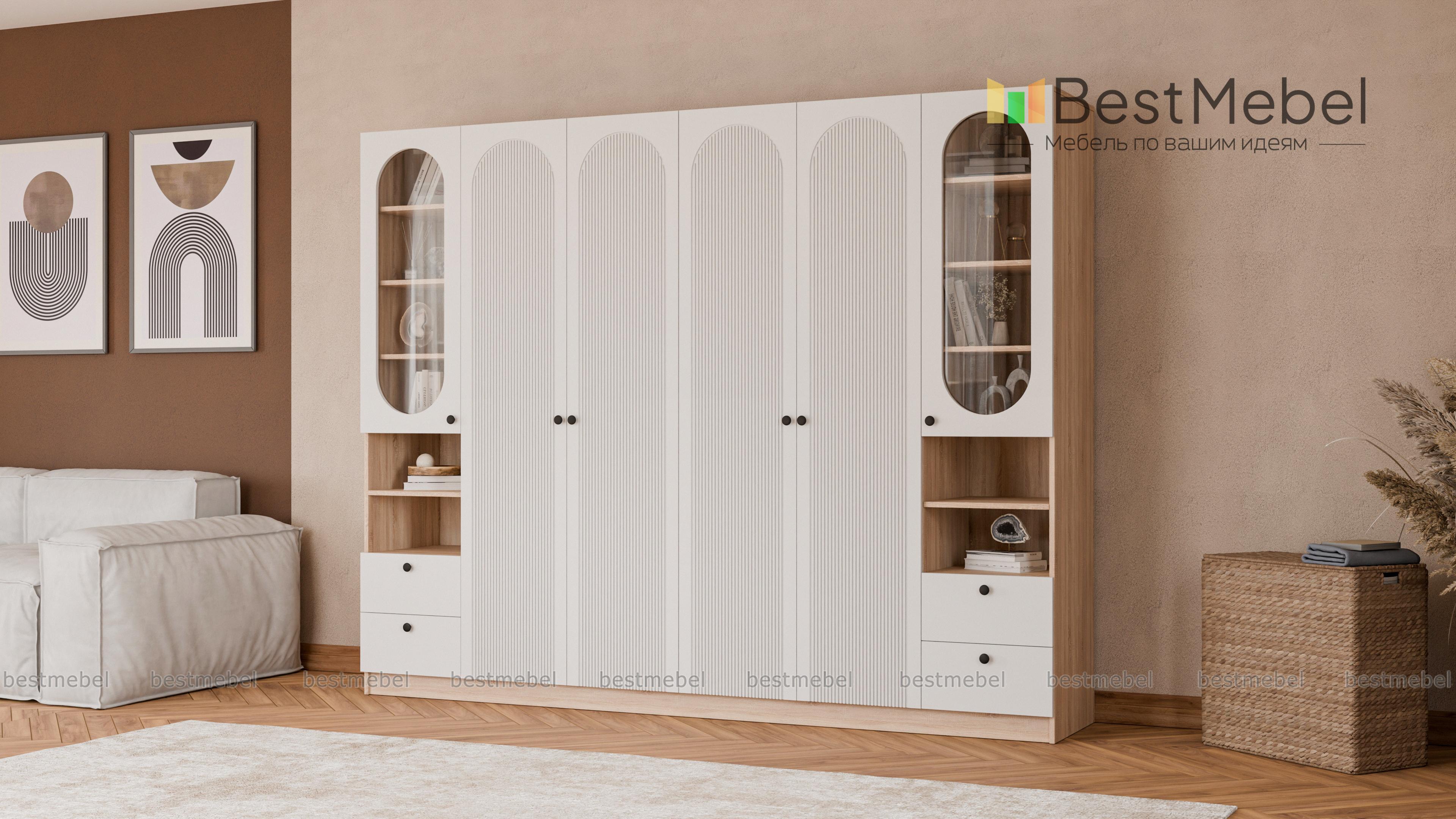 Шкаф распашной Рене 16 BMS представляет собой комбинацию двух платяных отделений в центре и двух витрин. Габаритная конструкция не выглядит громоздко благодаря светлому оттенку корпуса и фасадов, изящной фрезеровке арками и овальным вырезам. Разноплановые отделения позволяют разместить как одежду, так и книги, бокалы, всевозможные мелочи и интерьерные аксессуары. Купить шкаф распашной Рене 16 BMS вы сможете в нашем интернет-магазине с изготовлением по индивидуальным размерам.