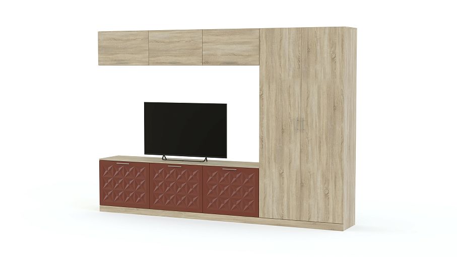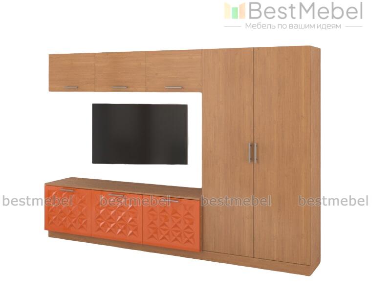 Стенка Вельвет 7 BMS понравится тем, кто предпочитает лаконичные формы и функциональность современного стиля. Простой по форме, комплект поможет эффектно оформить зону ТВ и разместить одежду, предметы декора и многое другое. Модель оборудована широкой низкой тумбой под ТВ, навесными секциями с откидными дверцами и платяным шкафом. Яркий оттенок фасадов с рельефным рисунком интересно сочетается с теплыми древесными тонами. Купить стенку Вельвет 7 BMS недорого приглашаем в наш интернет-магазин.