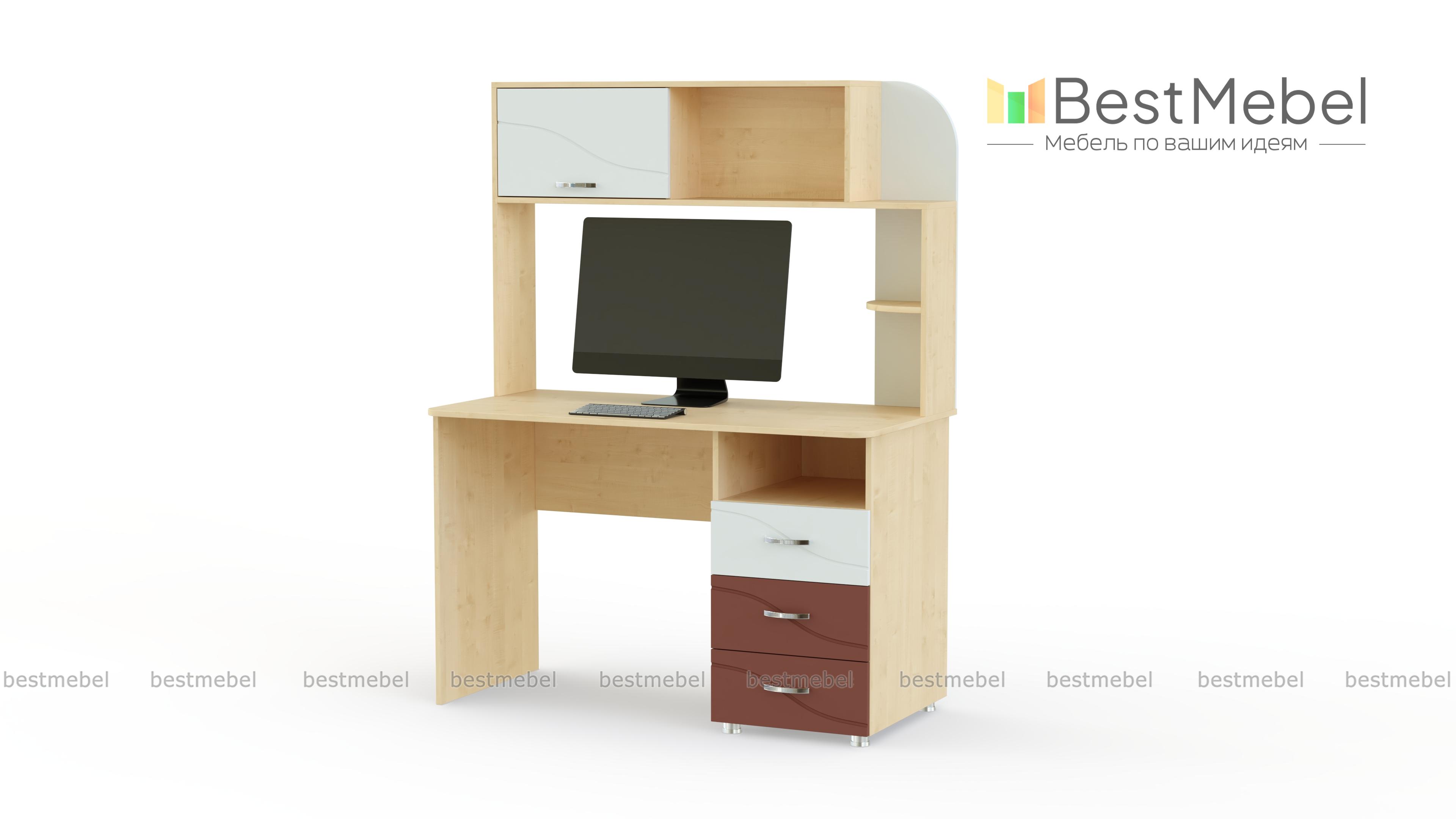 Письменный стол Розали BMS эффектно дополнит рабочее место. Если в вашем кабинете или в комнате подростка мало места, то стоит отдать предпочтение этому столу. Он оборудован не только удобной, оптимальной высоты столешницей, но и функциональной надстройкой. Она сможет заменить комод или тумбу, что значительно экономит пространство. Под столешницей тоже имеется тумба с вместительными выдвижными ящиками. Изделие оформлено в приятную цветовую гамму и дополняется цветными вставками. Купить письменный стол Розали BMS на сайте интернет-магазина можно по низкой цене.