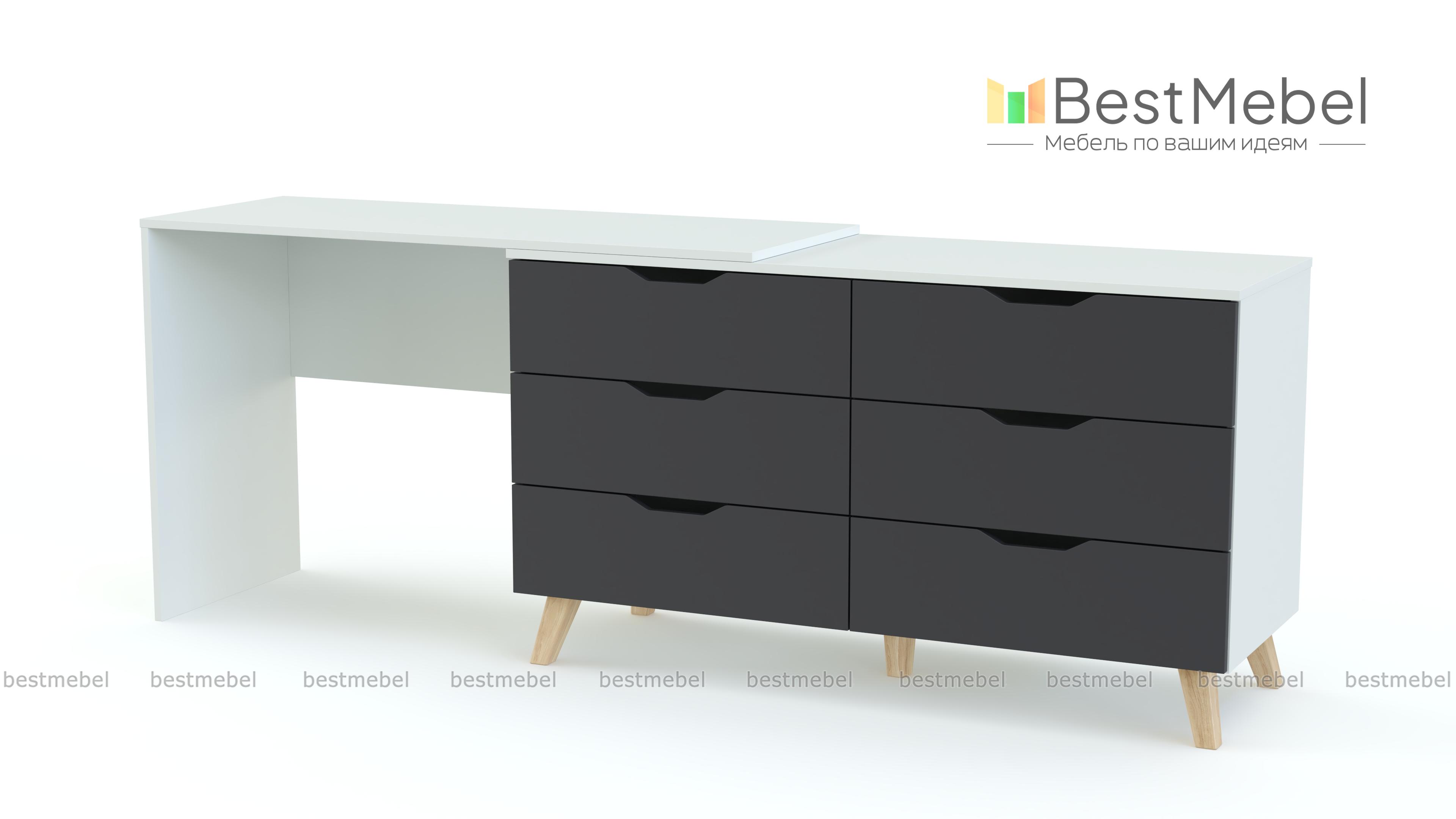 Туалетный столик Адам BMS – это многофункциональная модель, которую вы сможете использовать не только для хранения постельного белья, аксессуаров и разнообразных мелочей, но и для ухода за собой или работы за ноутбуком. Лаконичный комод в скандинавском стиле оборудован шестью выдвижными ящиками с ручками-вырезами, высокими скошенными ножками и совмещен со столом. Купить туалетный столик Адам BMS, выполненный в сочетании древесных тонов и белого, приглашаем в наш интернет-магазин.