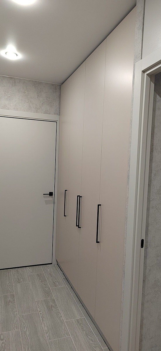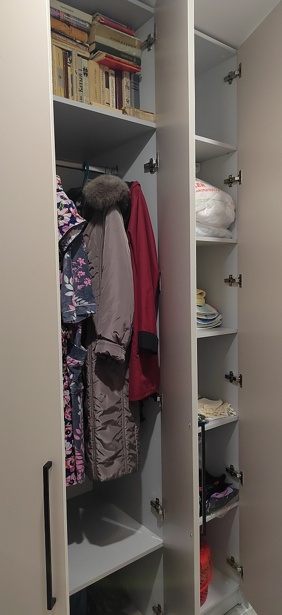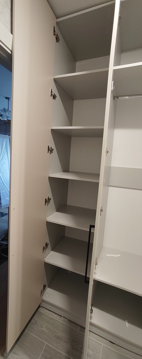 Шкаф распашной Остин Лайт 3 BMS (1860х2490х550), заказ 00000204766. Делали ремонт в коридоре и необходимо было заменить два шкафа, прихожую и дверцы на антресолях. Всё заказали здесь. Увидели на сайте этот шкаф и поняли - это то, что искали. Самостоятельно поменяли размеры, цвет фасадов (Тэффи L) и цвет самого шкафа (серый), кромку лицевых частей на 2 мм. ручки оставили эти (понравились), петли поменяли на Блюмовские с доводчиками. Внутри не меняли, был как надо. Середина - штанга и две полки (сверху и снизу), по бокам полки. Получился очень большой и вместительный шкаф. После оформления заказа на сайте, перезвонила менеджер (минут через 20), еще раз всё уточнила и перепроверила, помогла с точными размерами, чтобы шкаф точно встал в нишу. Всё изготовили быстро. Позвонили и согласовали день доставки. Доставка хорошая, оформляли с поднятием в квартиру. Комплектация полная, всё целое. Выдали документы с гарантией и телефоном компании по сборке. Позвонили туда и через час с нами связался сборщик, согласовали уже с ним дату и время. Отличный парень по сборке мебели. Собрал нам сразу два шкафа и прихожую за 4 часа. Спасибо, что появился такой интернет-магазин! Цена шкафа намного ниже, чем заказывать в компаниях по изготовлению мебели на заказ (узнавали в 5 компаниях) и сроки изготовления в несколько раз быстрее. Спасибо, что появился такой интернет-магазин!