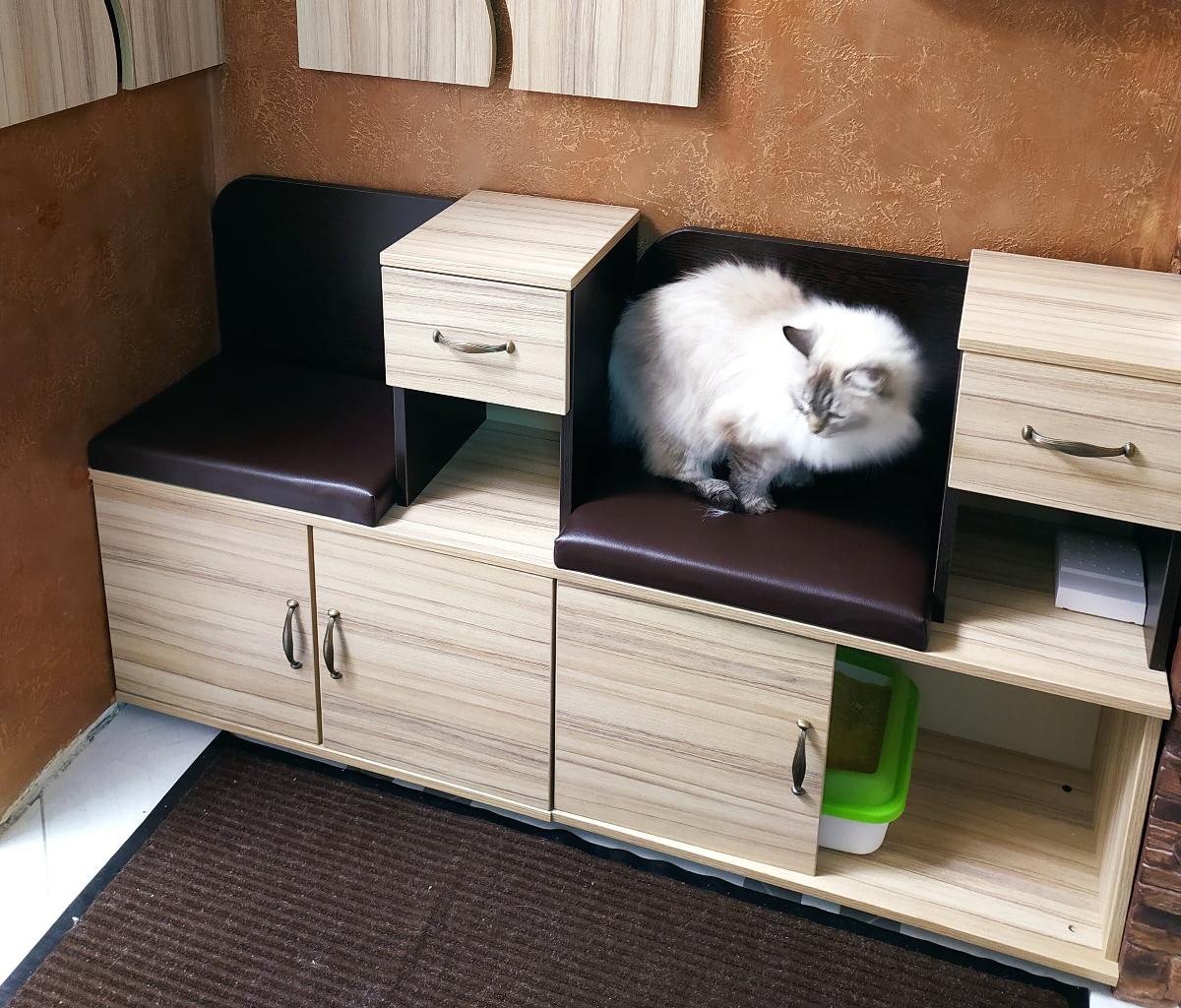 Тумбы очень здорово подошли в наш миниатюрный коридор. Одну тумбочку выделили под кошачий туалет (дверцу и полочки в ней не стали устанавливать просто). Очень эстетично получилось, туалет не виден практически и не мешает никому. Вторая тумбочка используется по назначению Возможно надо было заказать их зеркальными, но догадались уже потом. Но так тоже нормально, не критично.