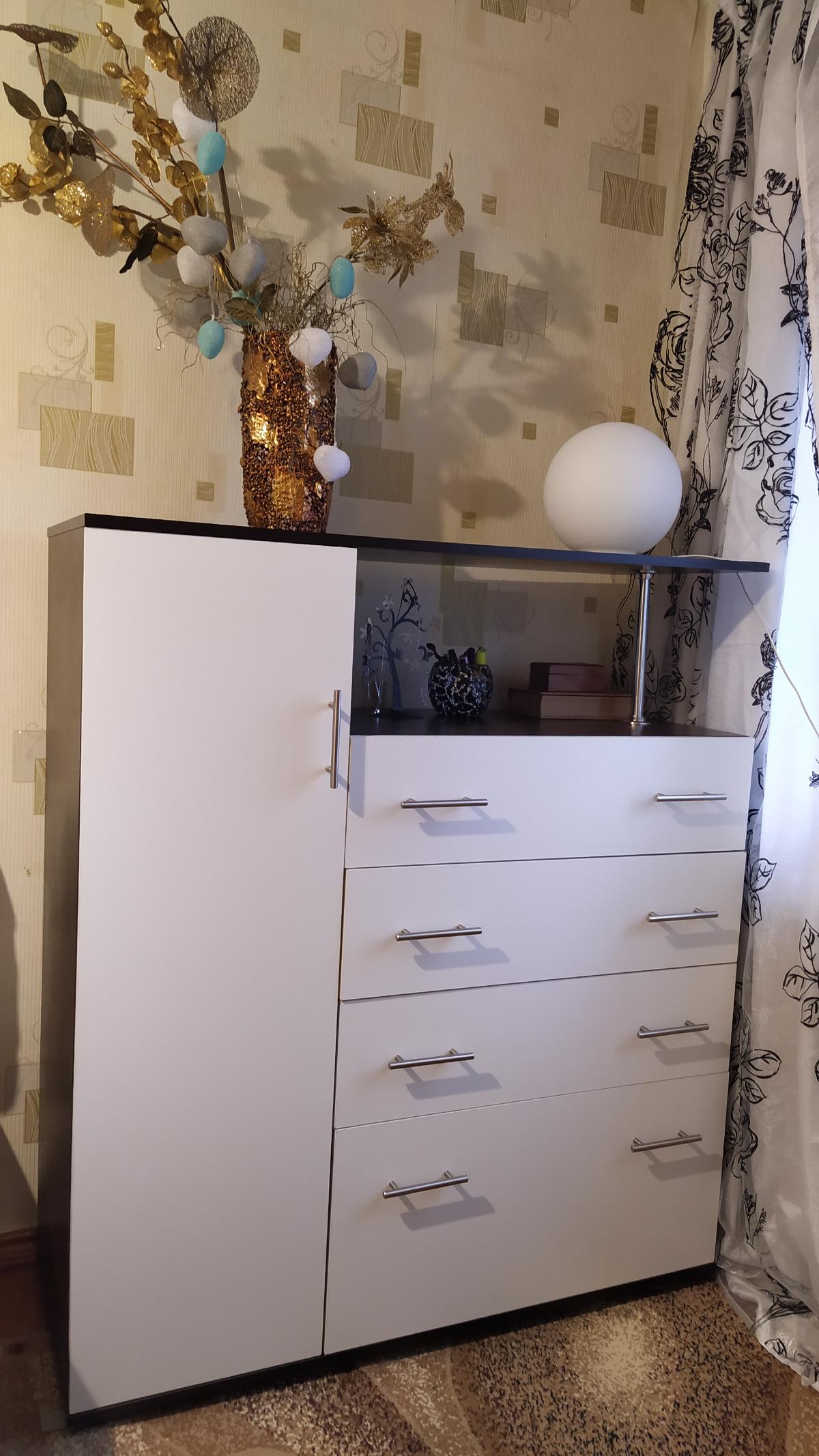 Покупала этот комод почти год назад. Большой плюс, что при выборе можно самому выбрать цвет, фурнитуру, материал по своему желанию и предпочтениям. Комод очень понравился, служит исправно уже почти год - нареканий нет. Собирали сами по схеме, пришлось повозиться, но результат порадовал. Совет - не экономьте сразу на фурнитуре, от нее зависит многое. В целом - рекомендую к покупке.